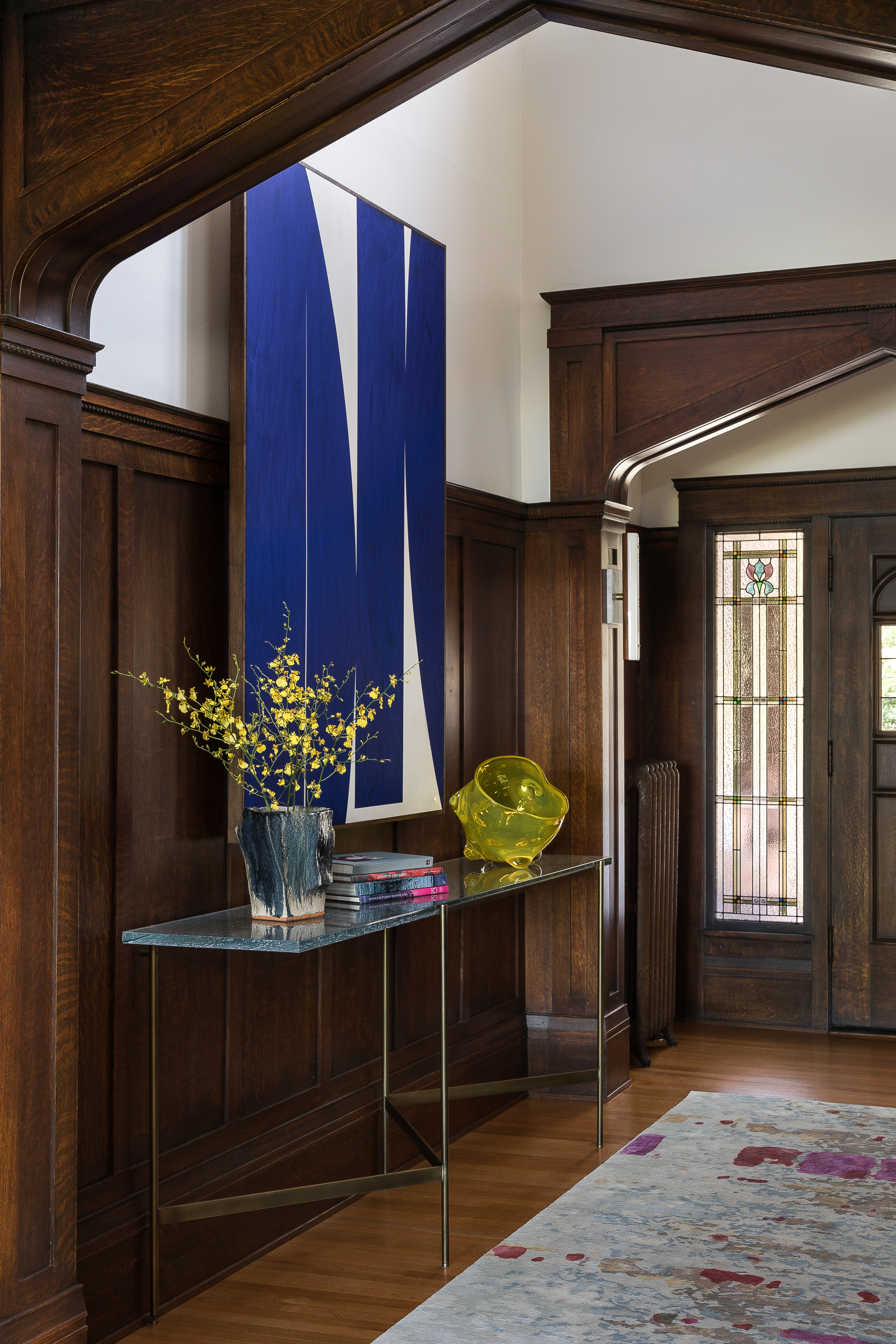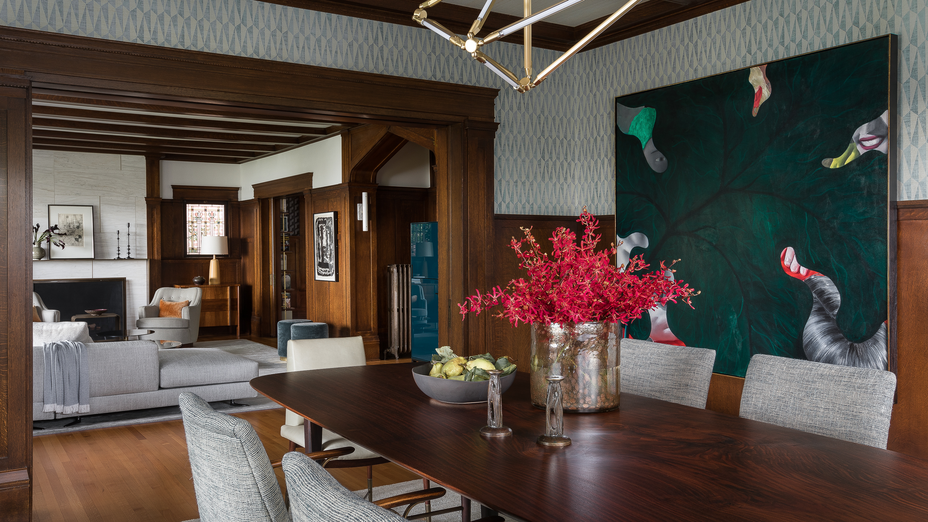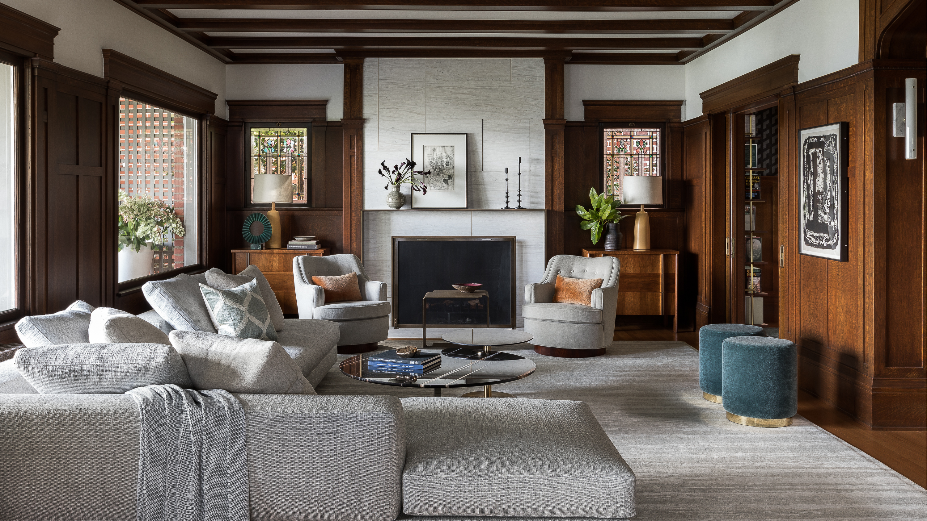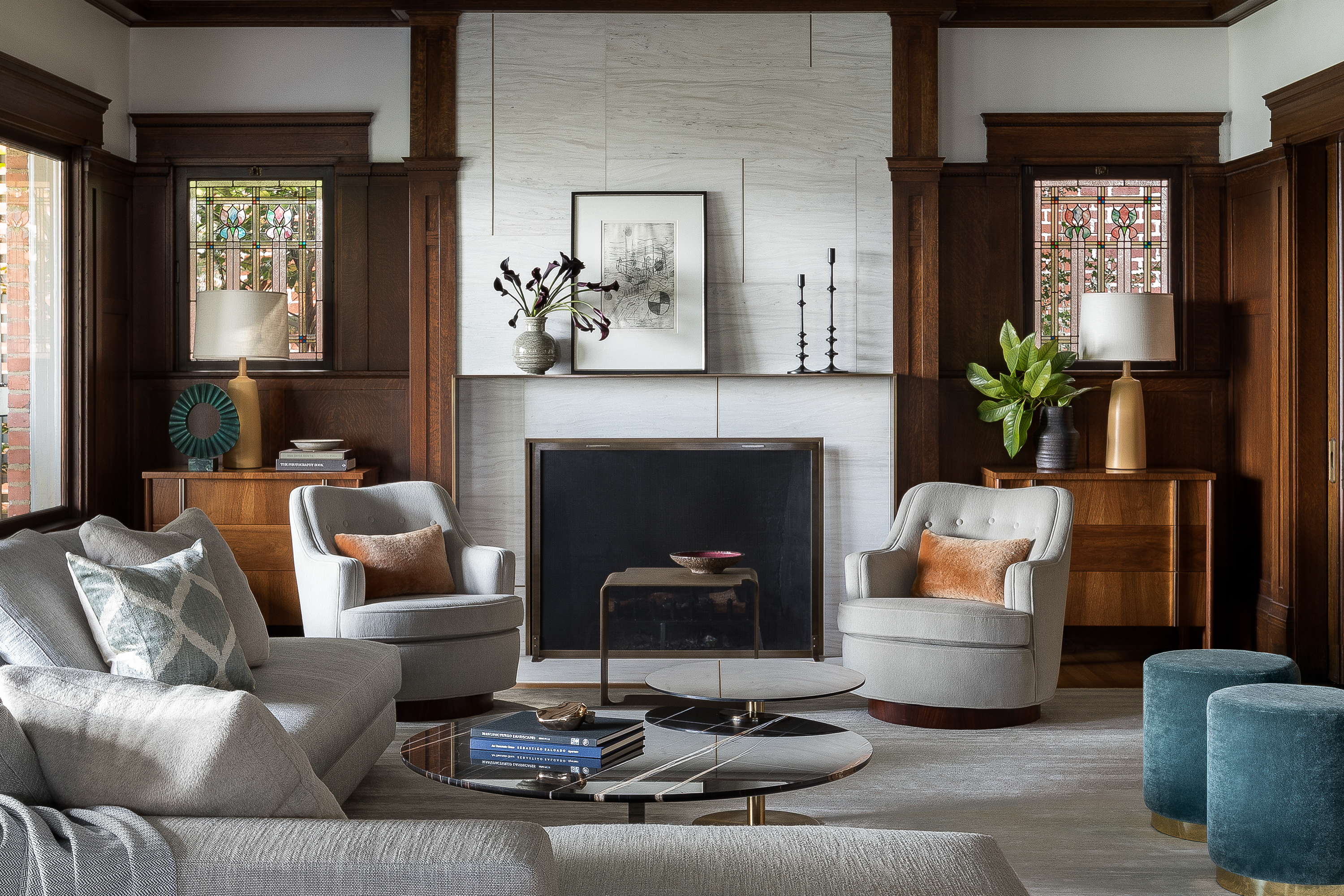 A young couple moving back into the husband’s childhood home—a historic lakefront Tudor with a dark, Gothic interior—had ambitions for a light and bright contemporary environment. Responsibility for a generational change of stewardship brought emotional as well as design challenges, but with respectful intentions the client and design team were able to shift the vocabulary and spirit of the once formal space. Layering the environment with new materials such as marble, bronze and light painted finishes enabled the excessive ornamentation—found in arches, paneling and period tile—to be reimagined. With a focus on comfort, scale and sculptural form, custom contemporary furnishings helped connect the clients’ desire for modern living with the storied history of the home.
