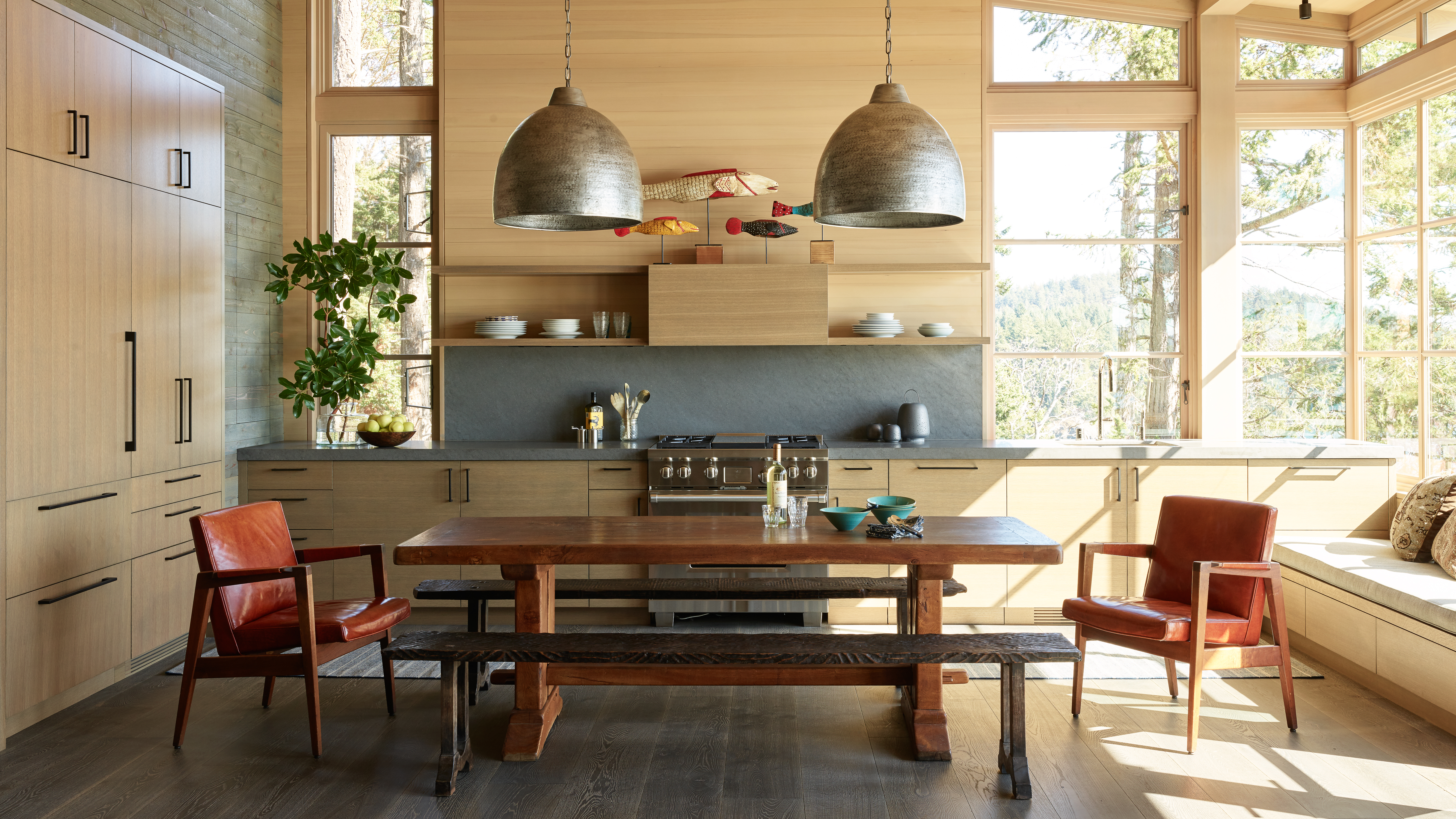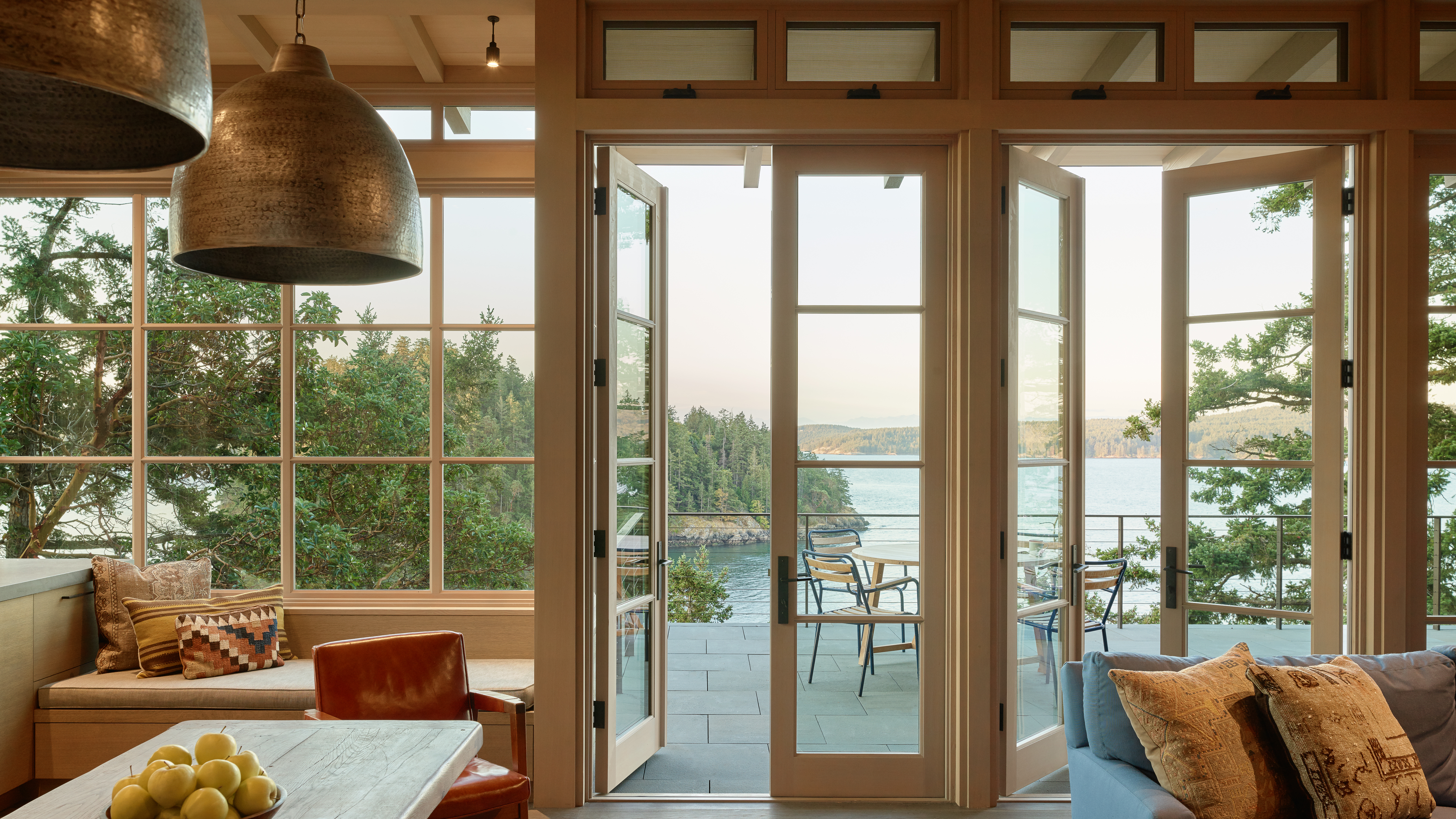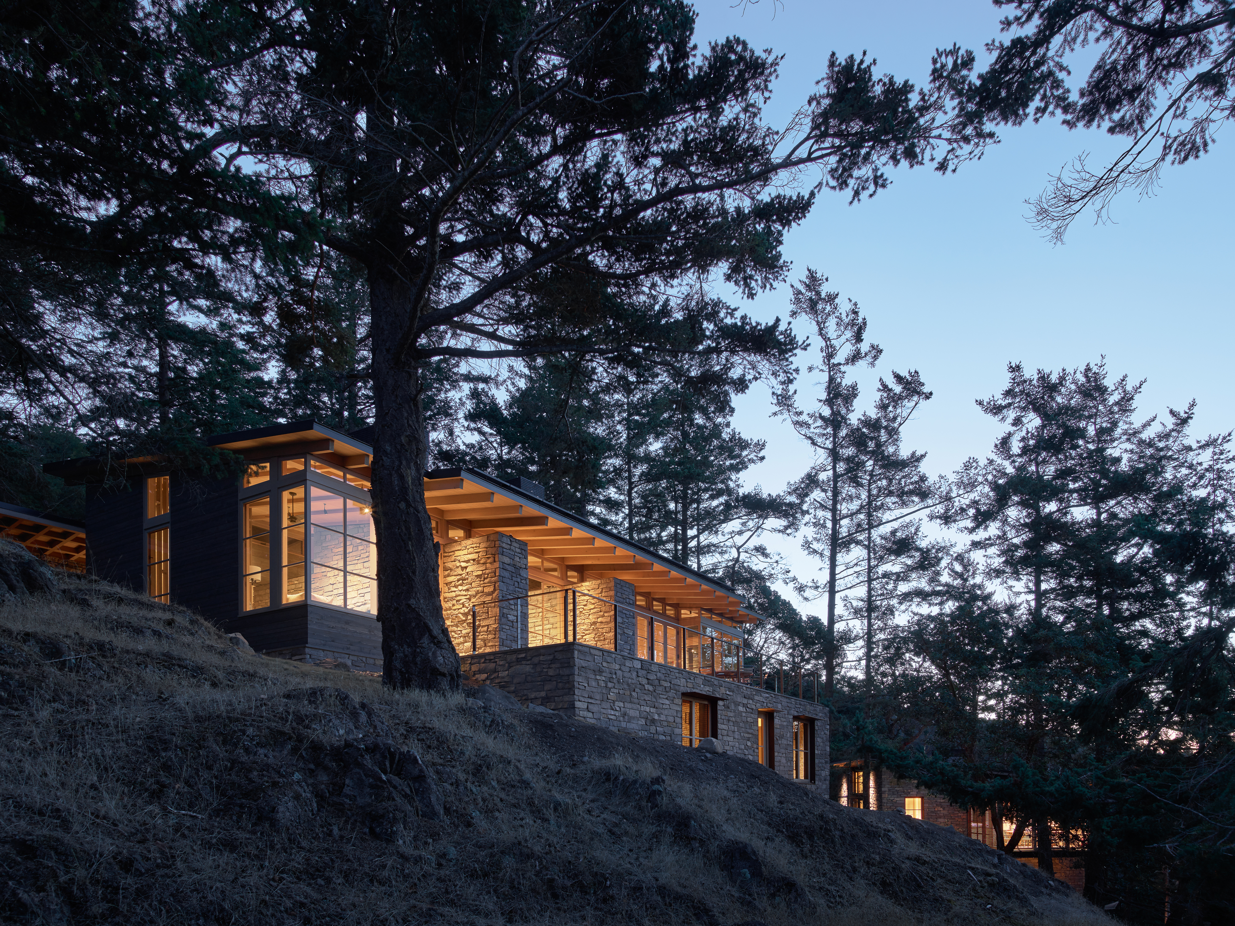 Taking inspiration from its remote site in the San Juan Islands, our design team conceived of the new home as a series of simple stone volumes growing naturally from their rugged surroundings. The site’s steep slope and the presence of a road directly behind it suggested a stone plinth and stone wall to form the base and rear of the house. A pair of massive stone fireplaces rising together within the home’s interior enhanced the concept, separating the main level into public and private realms flanking a central stone staircase. The extended plinth, finally, allowed the interior spaces to flow beyond the building envelope into a seamless outdoor living area with spectacular views.