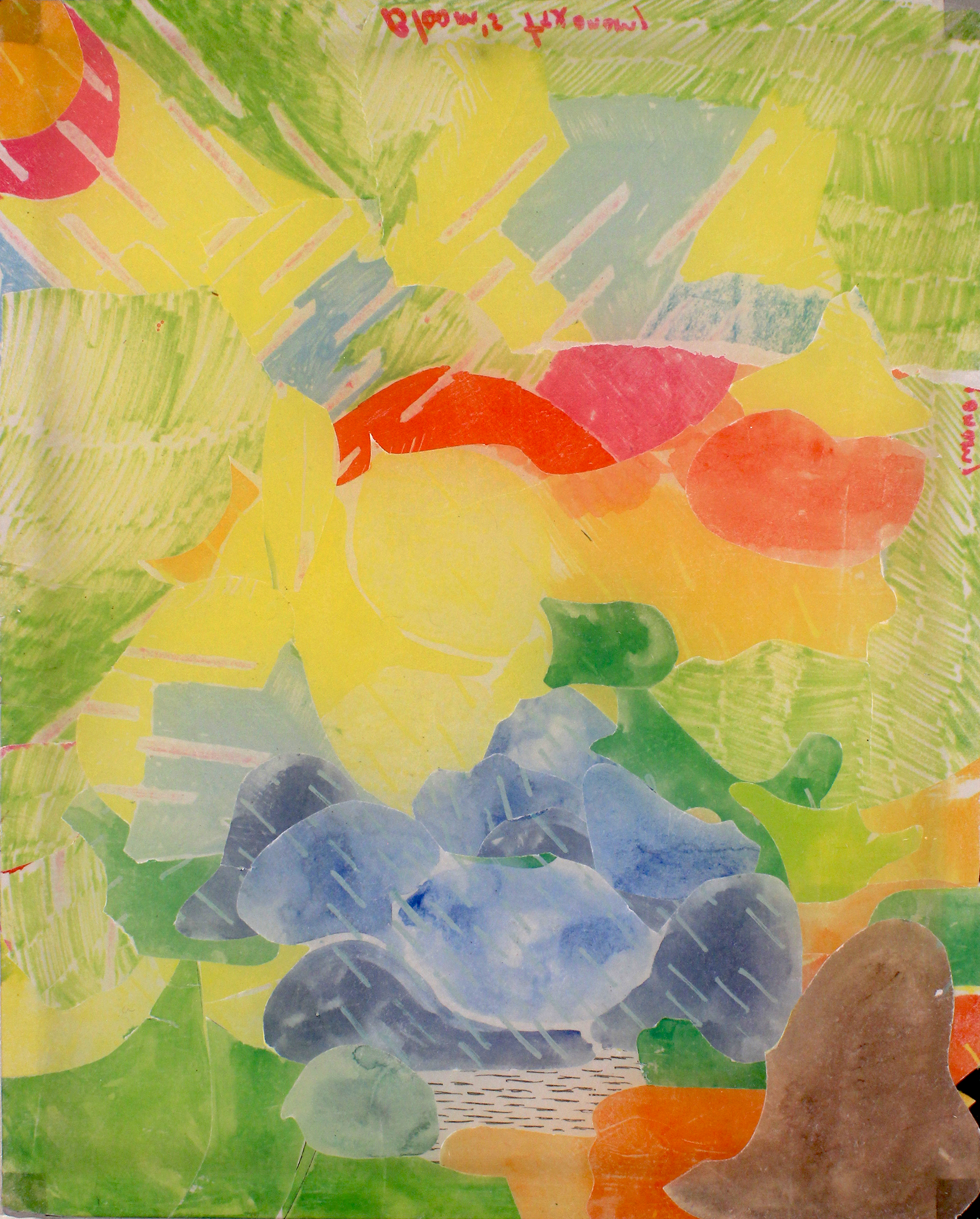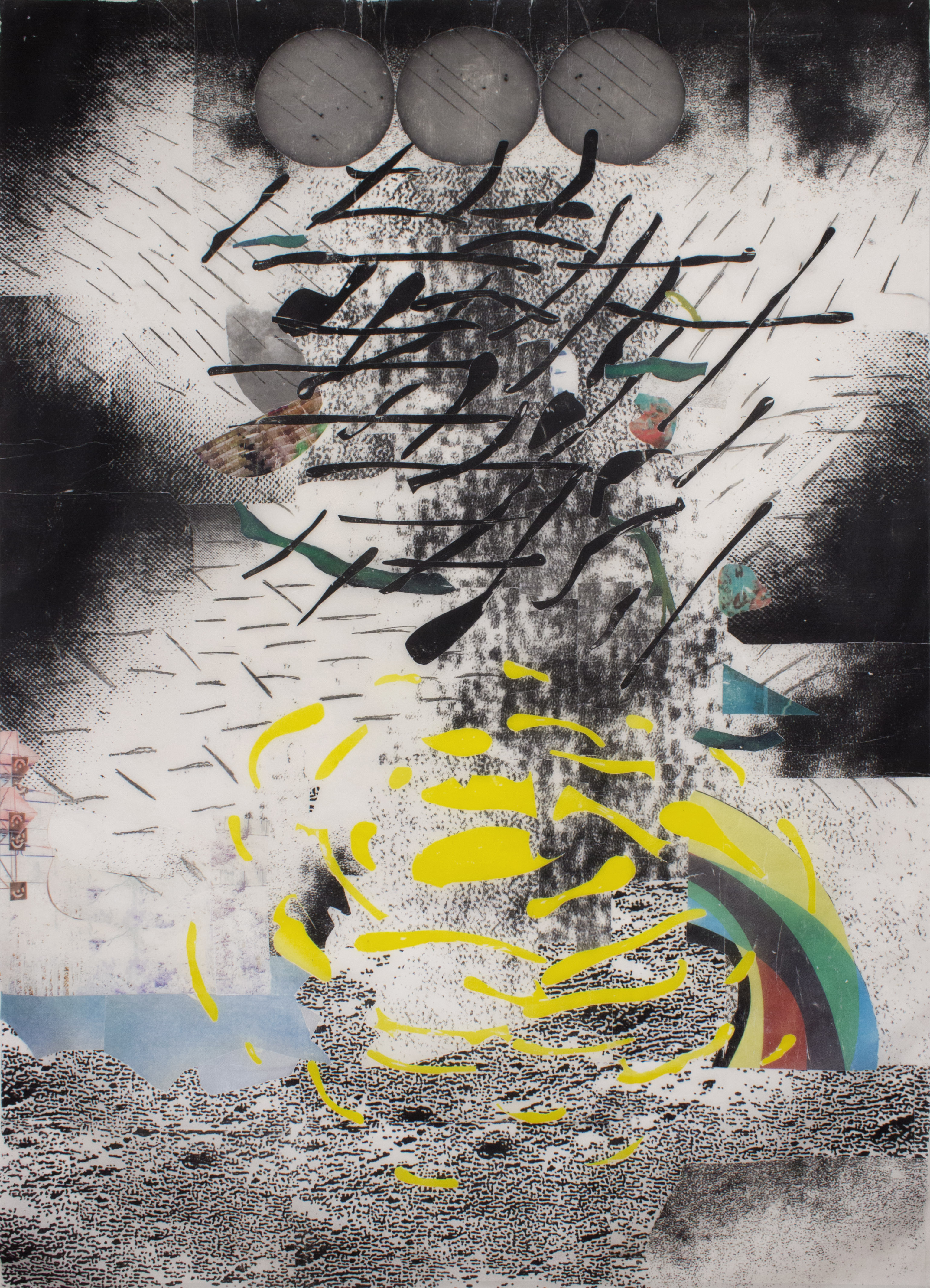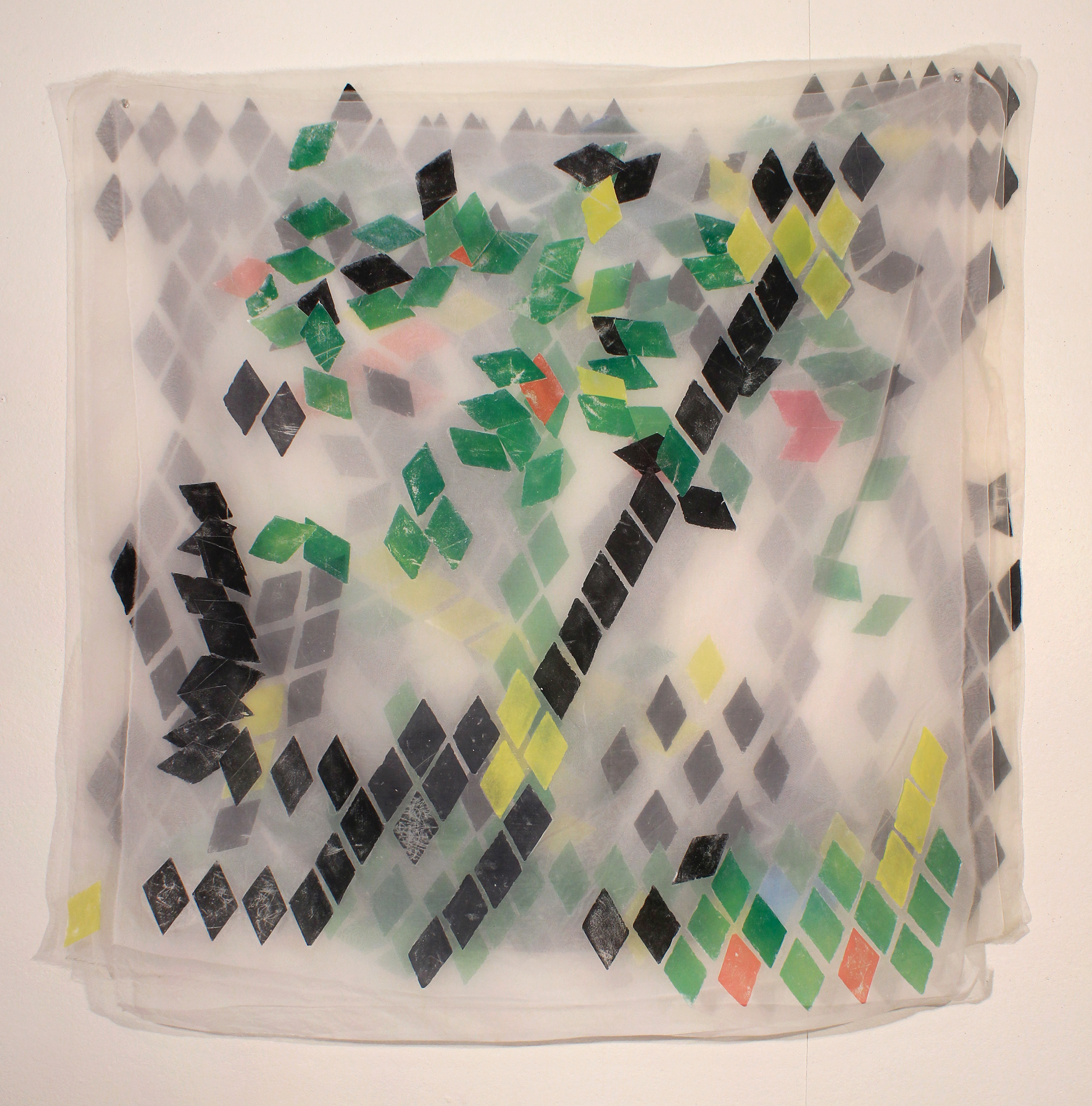 tiled photocopies, yellow stick, orange straw, wood scrap,