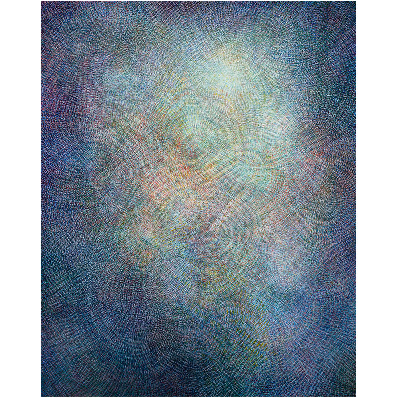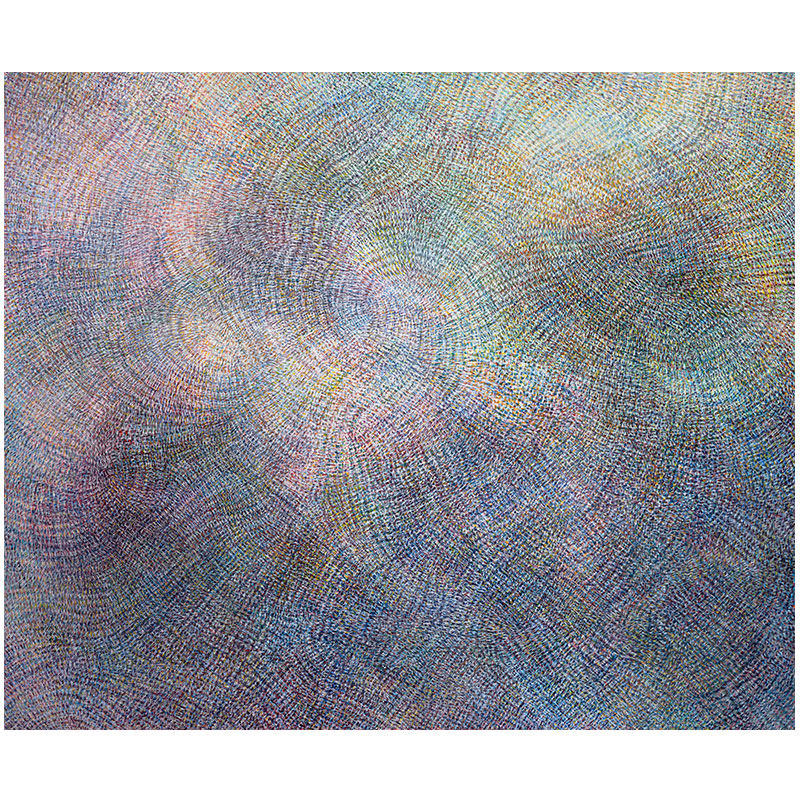 Park’s unique approach to representation and the inclusion of energy fields and multidimensional perspective enliven his subject matter. In his new series, any hint of realism becomes entirely unrecognizable through tiny dotted marks and layered swirling patterns. The exhibition title Starling metaphorically connects Park’s active gestures to bird “murmurations,” a phenomenon of shape-shifting avian flocks that move in rapid bursts of synchronicity. Park’s latest series share visual similarities with this natural wonder, with thousands of painted lines vibrating and expanding like living organisms.