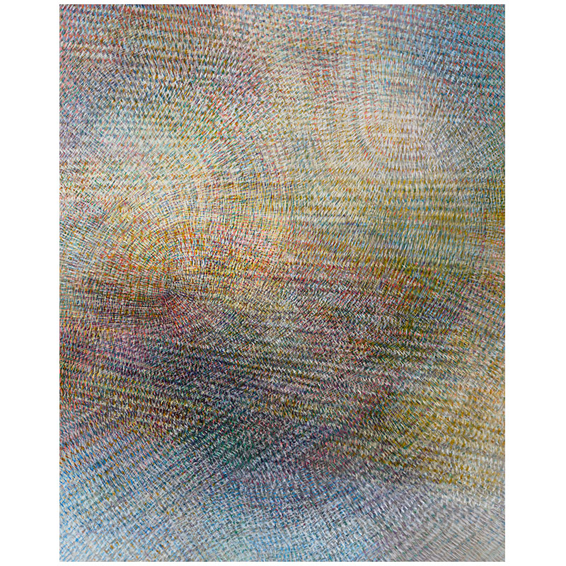 Joseph Park’s new series of paintings titled Starling convey visceral energy through the artist’s colorful accumulations of fine lines. His prismatic pastel mark-making radiates with kinetic energy and finds eclectic inspiration in art historical movements and philosophies ranging from the Op Art of Bridget Riley, the Northwest mysticism of Mark Tobey and Morris Graves to the transcendental art-making ethos of Agnes Martin.