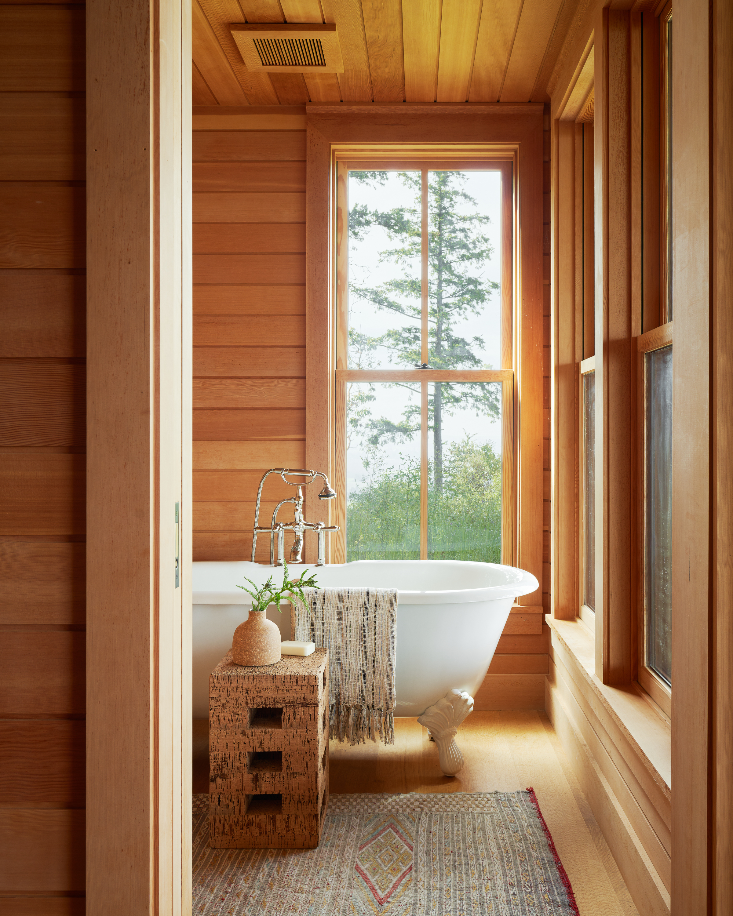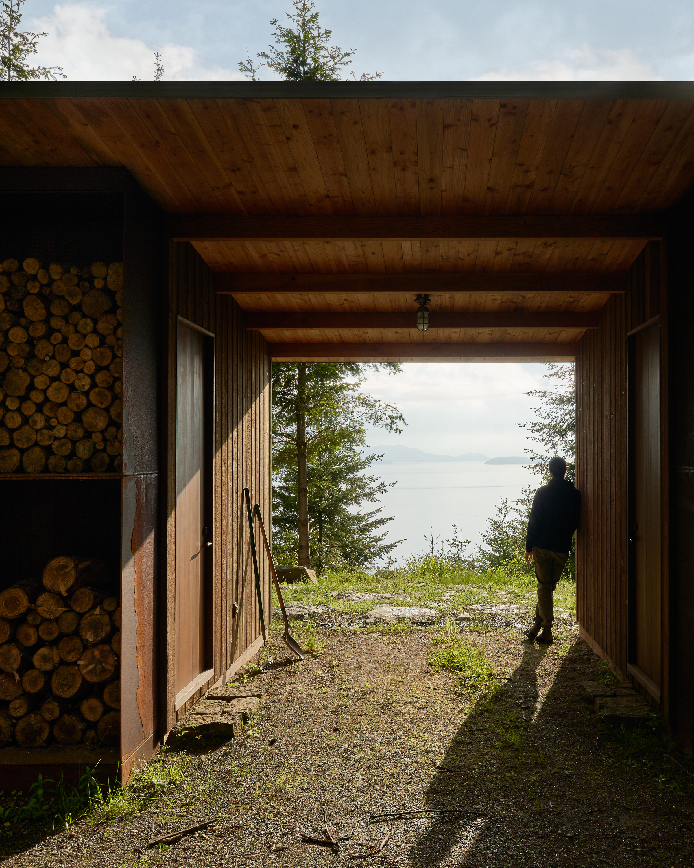 When the client asked for one more building to house storage, a writing studio, and firewood we demurred on the concept and opted for a building that erases its identity and masquerades as a stack of firewood. The outhouse had to be the last of the original concepts. The firewood building is designed to be first perceived and approached axially, allowing perspective to hide the building.