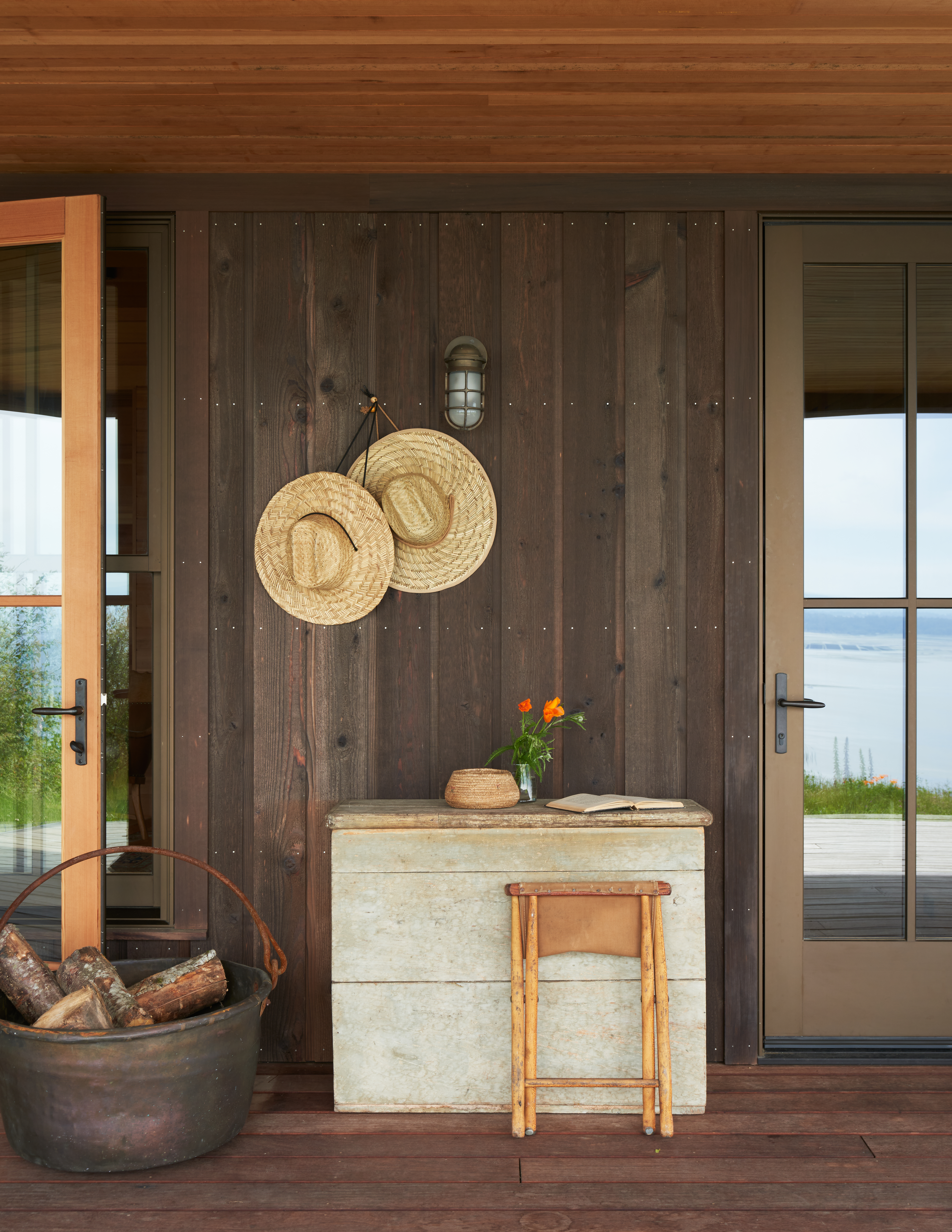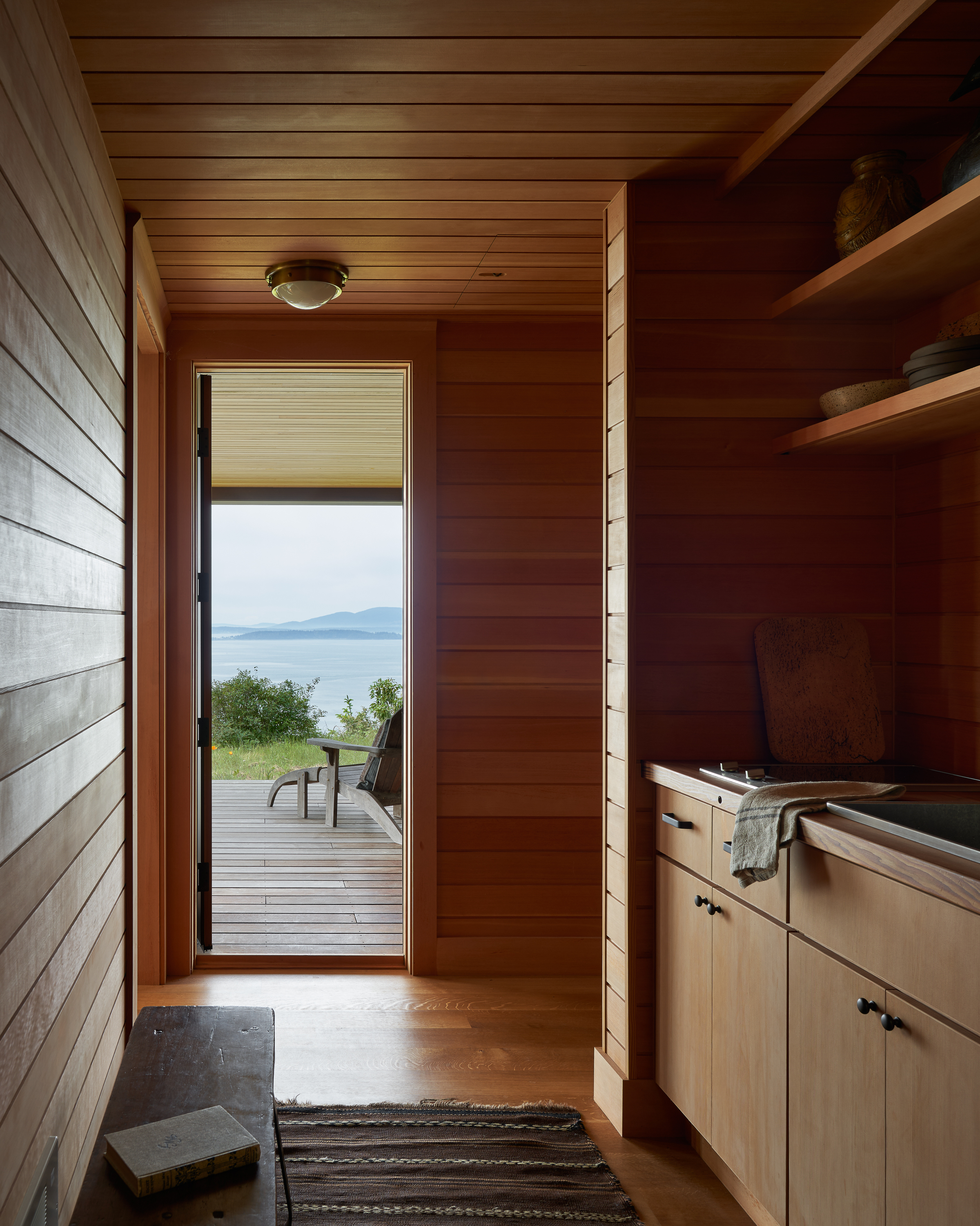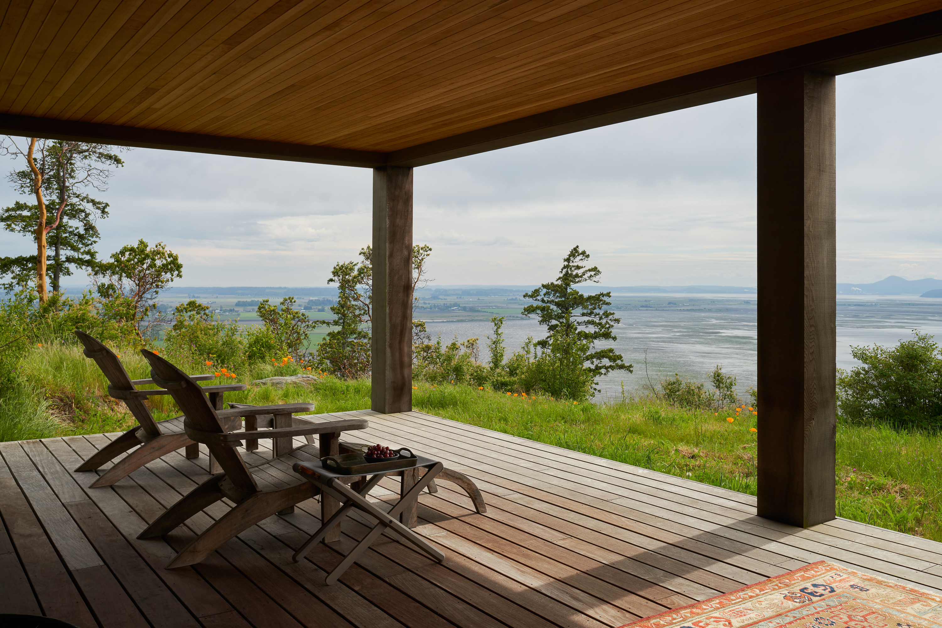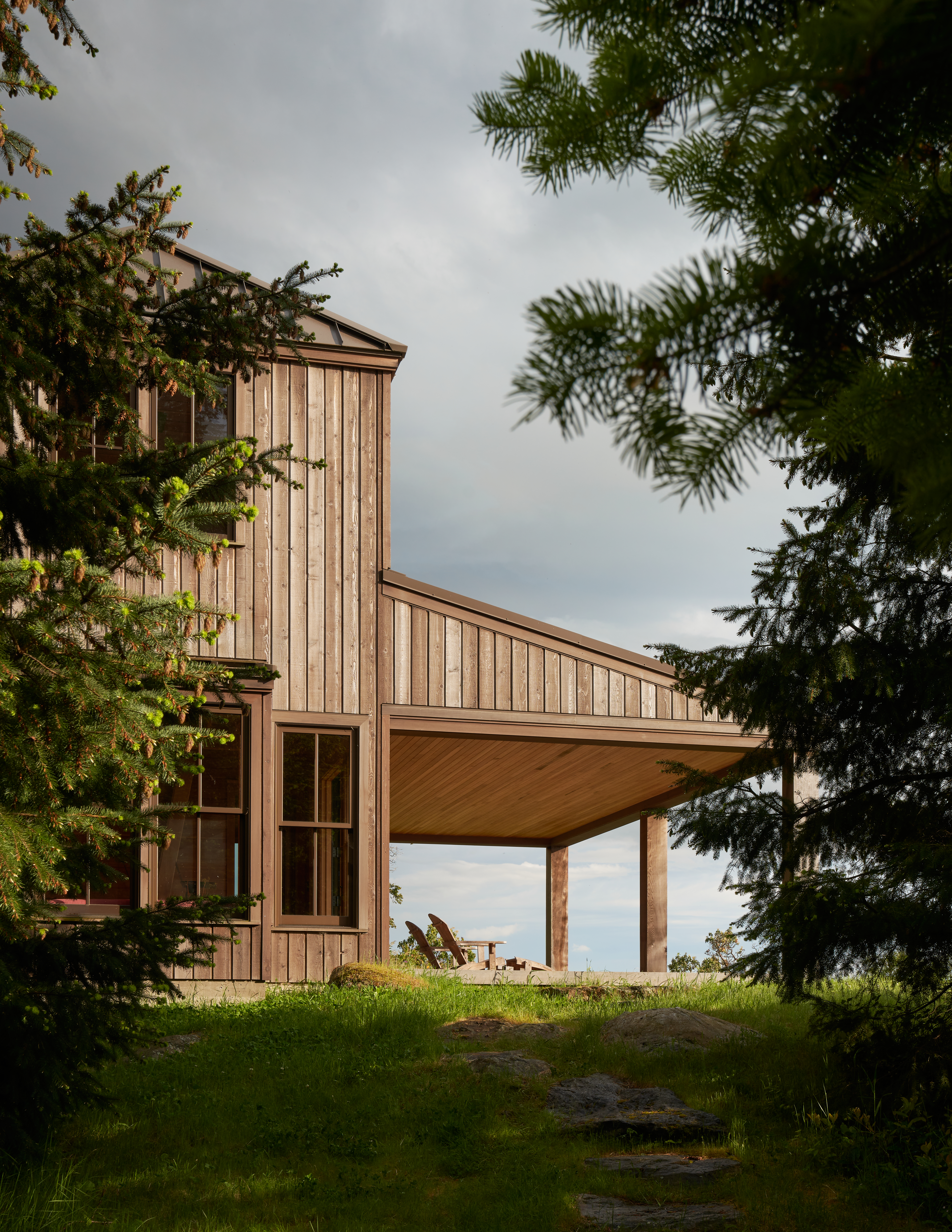 Much of the success of the project is owed to the landscape and the precise siting of the buildings, which provide prospect and refuge. The porches draw you in, creates a platform for viewing and in the case of the outbuilding, frames a vignette through the trees. Upon arrival you are drawn inside.
