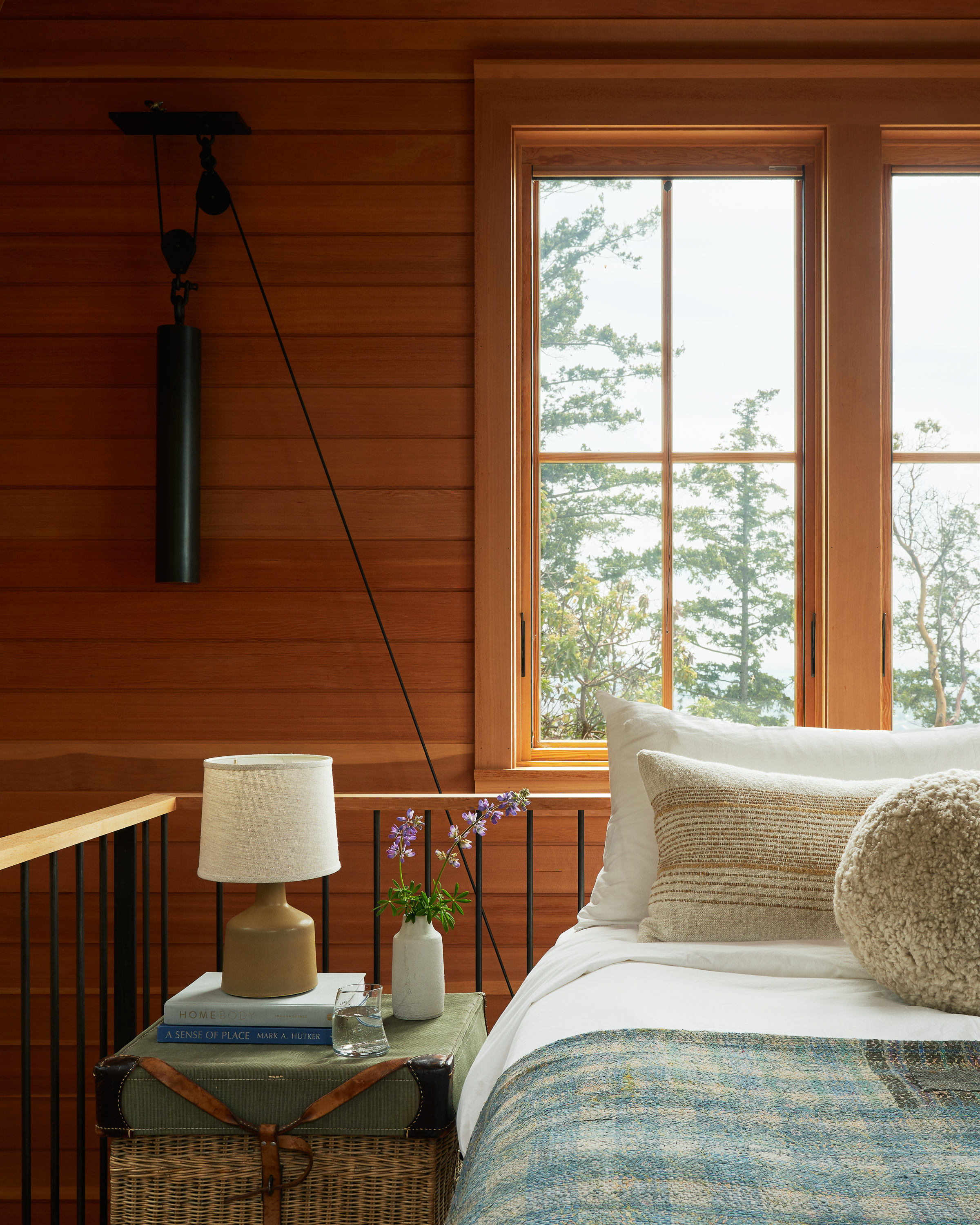 The ladder was necessary to access the sleeping loft however it impedes upon the function of the small living area below when in use. To alleviate the conflict the ladder can be lifted and held in place throughout most of the day. We designed a counterbalance to account for the weight of the ladder that becomes a fixture in the loft above, while the ladder itself blends seamlessly into the structure spanning the room.