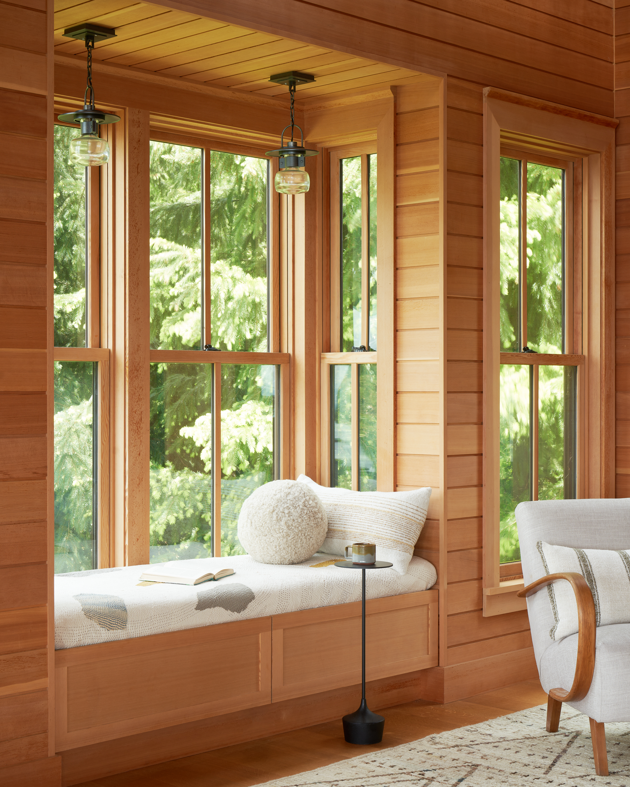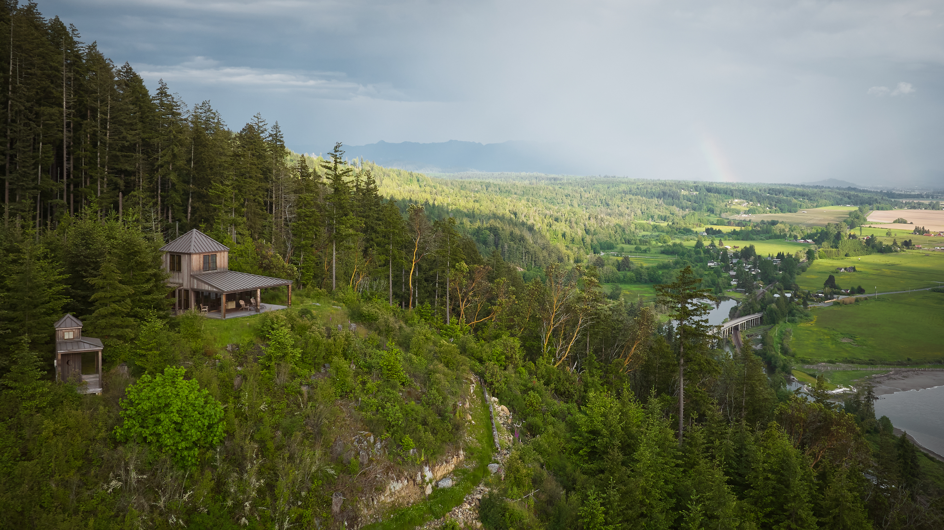 Perched on a rock halfway up a mountain the studio is a reward for those willing to make the hike. The plan plays with the idea of a square within a larger square. The double-height space holds a suspended sleeping platform reached by retractable ladder. Below the platform is a living area for creation or relaxation. A small bath, bunk room, and kitchenette provide amenity for extended stays. The ample porch reaches to the slope and provides one of the better views found in the pacific northwest.